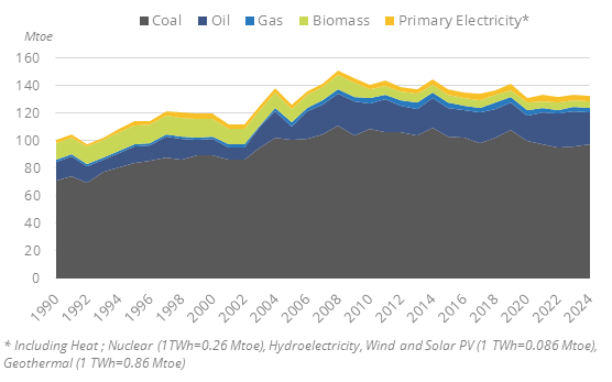 Total energy supply has remained relatively stable since 2020 at around 133 Mtoe. This follows a period of 1.2% per year decline since a peak of 151 Mtoe in 2008. Total primary consumption per capita has decreased by 2.7%/year since 2019, reaching 2.07 toe/cap in 2024.