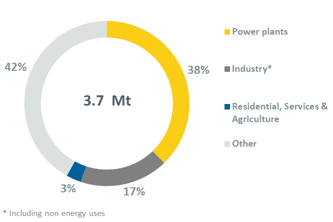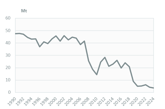 Coal consumption decreased by 14% in 2024 to 3.7 Mt after a 25% increase in 2022. Historically, coal has seen a steady drop in consumption since 2016; the most dramatic fall was in 2019, with a 76% decrease.