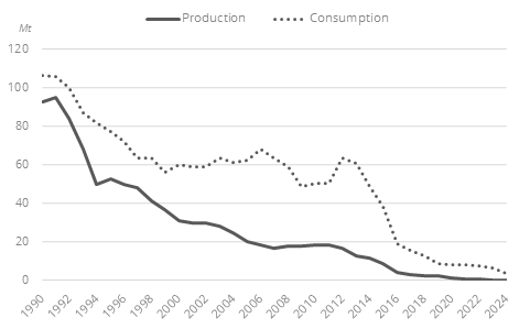 Coal production virtually stopped in 2024, after a sharp decrease since 2011 (25%/year). Deep mined coal production ceased in 2016.
