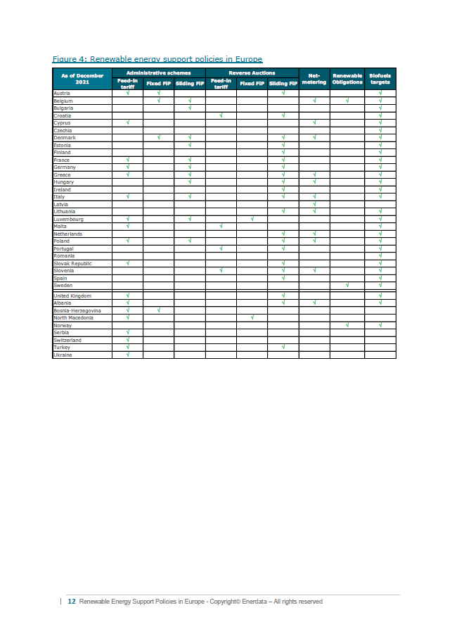 - Europe-wide overview of support schemes to promote renewable energy in power generation and transportation