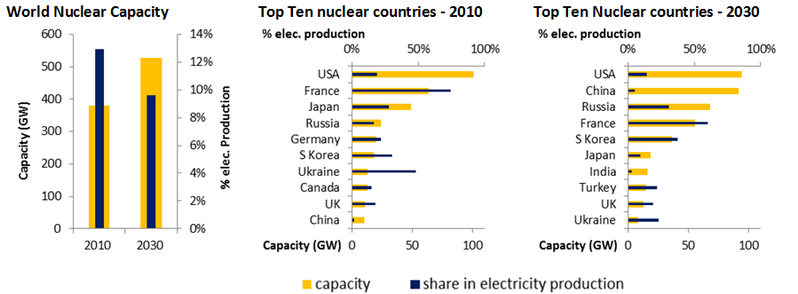 Nevertheless, despite the Fukushima accident, nuclear prospects to satisfy the fast growth rate of electricity demand remain high, notably in Russia and Emerging Asian Economies. By 2030, world nuclear capacities are expected to increase by 37% in a "business-as-usual" case and developing Asia will represent one quarter of the total installed capacity (compared to only 1% in 2010).