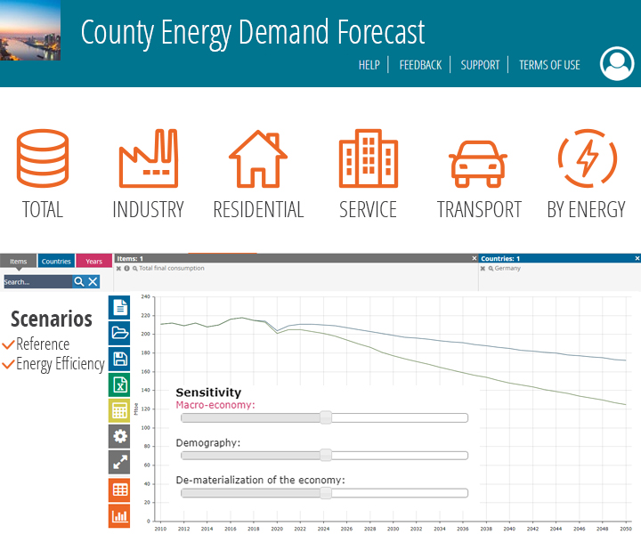 It allows users to track underlying factors throughout the industry, transport, residential and services sectors, as well as the dynamics of future energy demand thanks to a built-in sensitivity analysis to assess the impact of key drivers on energy use.