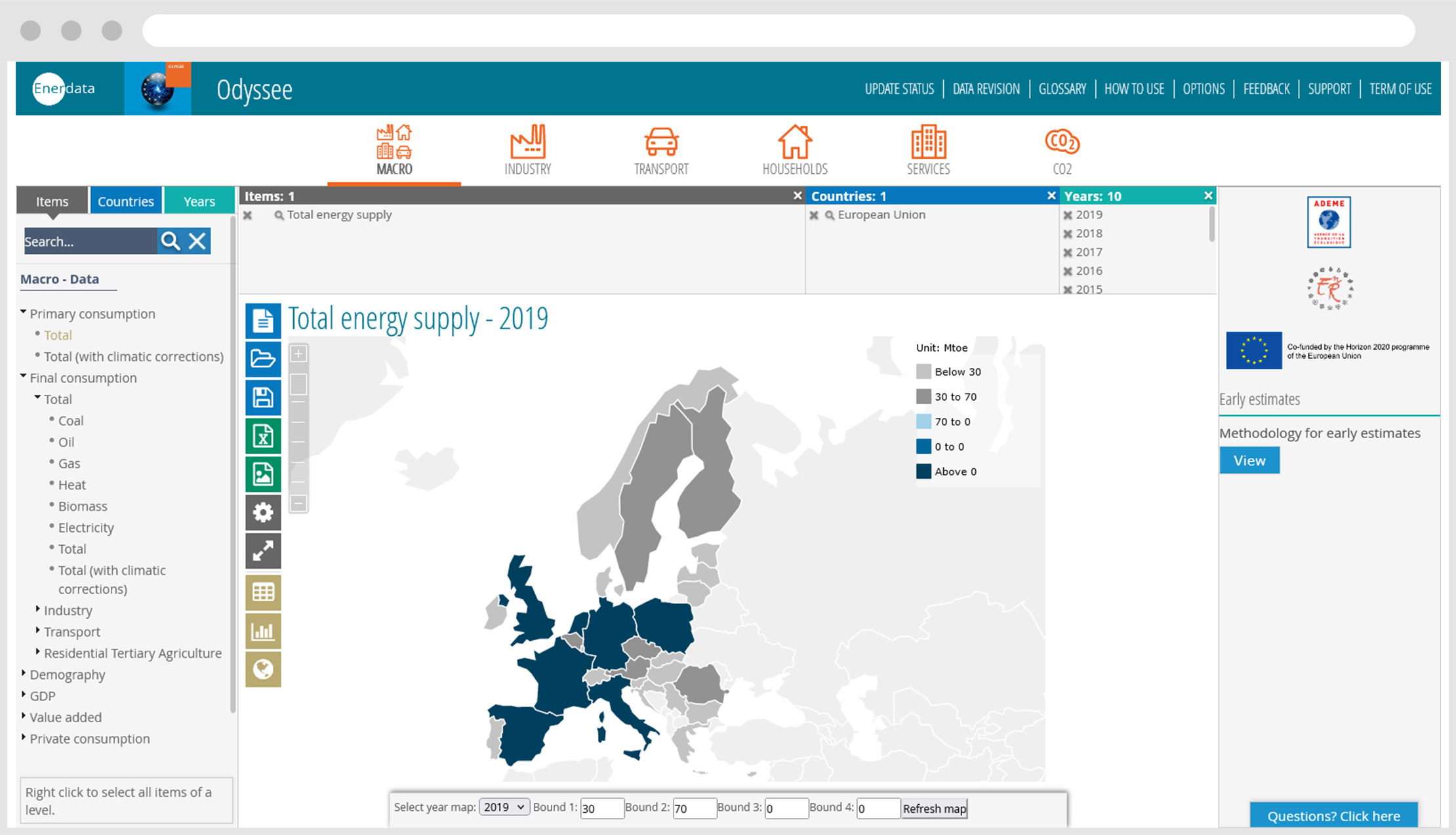 - Two databases that address your geographical coverage needs: 27 EU Member States + 10 European countries or WW coverage of the 22 most energy-consuming countries + aggregates